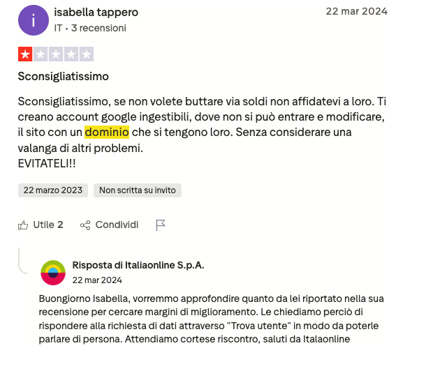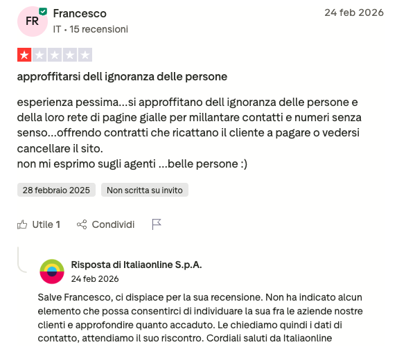 Le recensioni sono di dominio pubblico e sono visualizzabili attraverso il link https://it.trustpilot.com/review/www.italiaonline.it