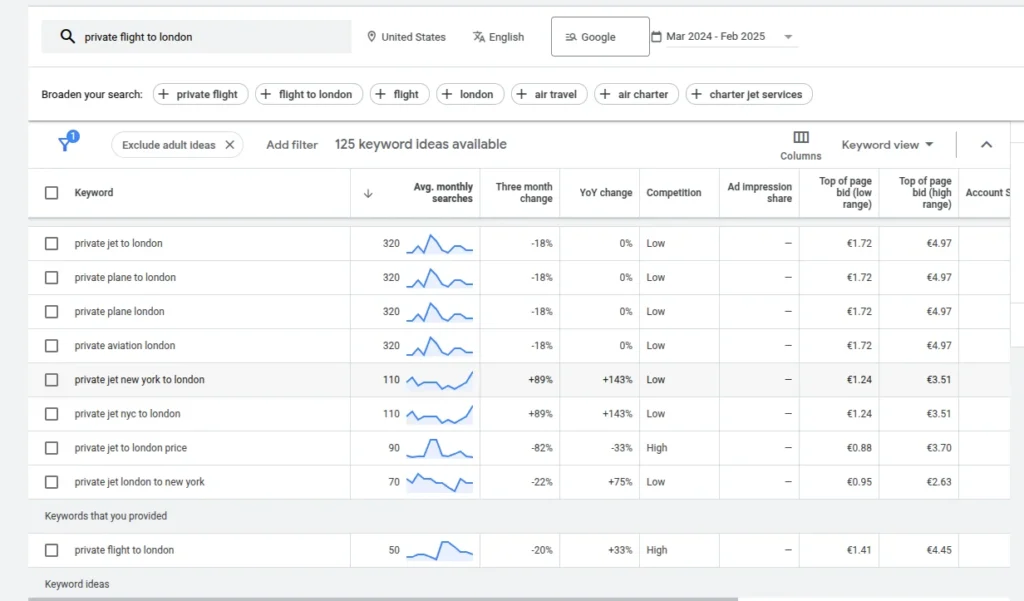 For instance, instead of bidding on highly competitive and expensive terms, look for phrases like “private flight from hong kong to shanghai”. These keywords may attract fewer searches overall, but they can lead to higher conversion rates and a better return on your investment. By prioritizing lower-cost keywords, you ensure that every dollar spent works harder for your business.