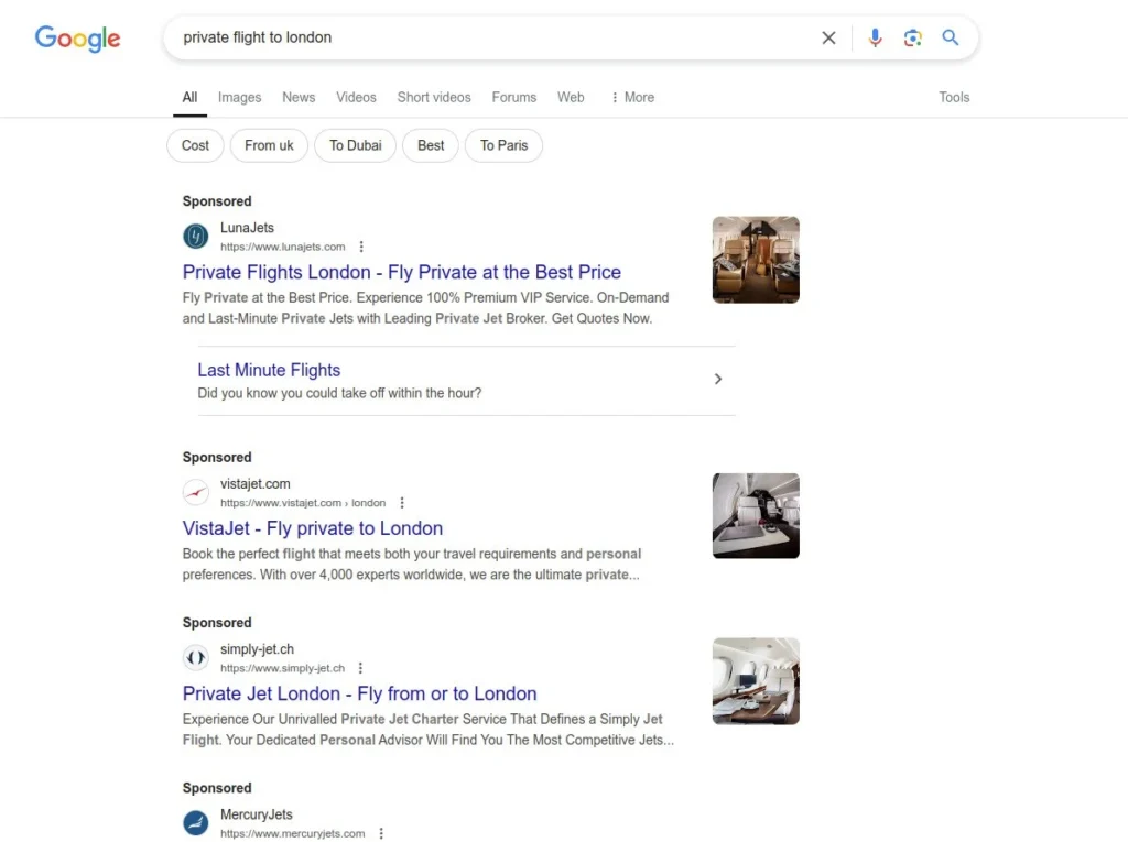 With Google Ads, however, your ad is triggered by searches such as “empty leg flights to dubai” or “last minute flights to tokyo” This ensures that only those with an active need see your ad. In essence, you’re getting noticed by only those who are already looking for what you offer, thereby maximizing both visibility and the effectiveness of your ad spend.